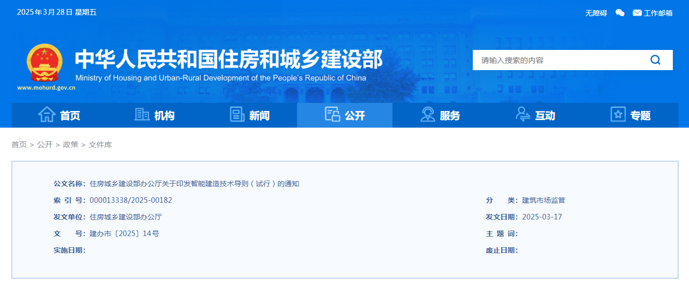 為貫徹落實《中共中央辦公廳、國務院辦公廳關于推進新型城市基礎設施建設打造韌性城市的意見》等文件要求,加快推進智能建造技術在工程建設全生命期應用,推動建筑業(yè)高質量發(fā)展,住房城鄉(xiāng)建設部組織編制了《智能建造技術導則(試行)》。現(xiàn)印發(fā)給你們,請結合實際參照執(zhí)行。
